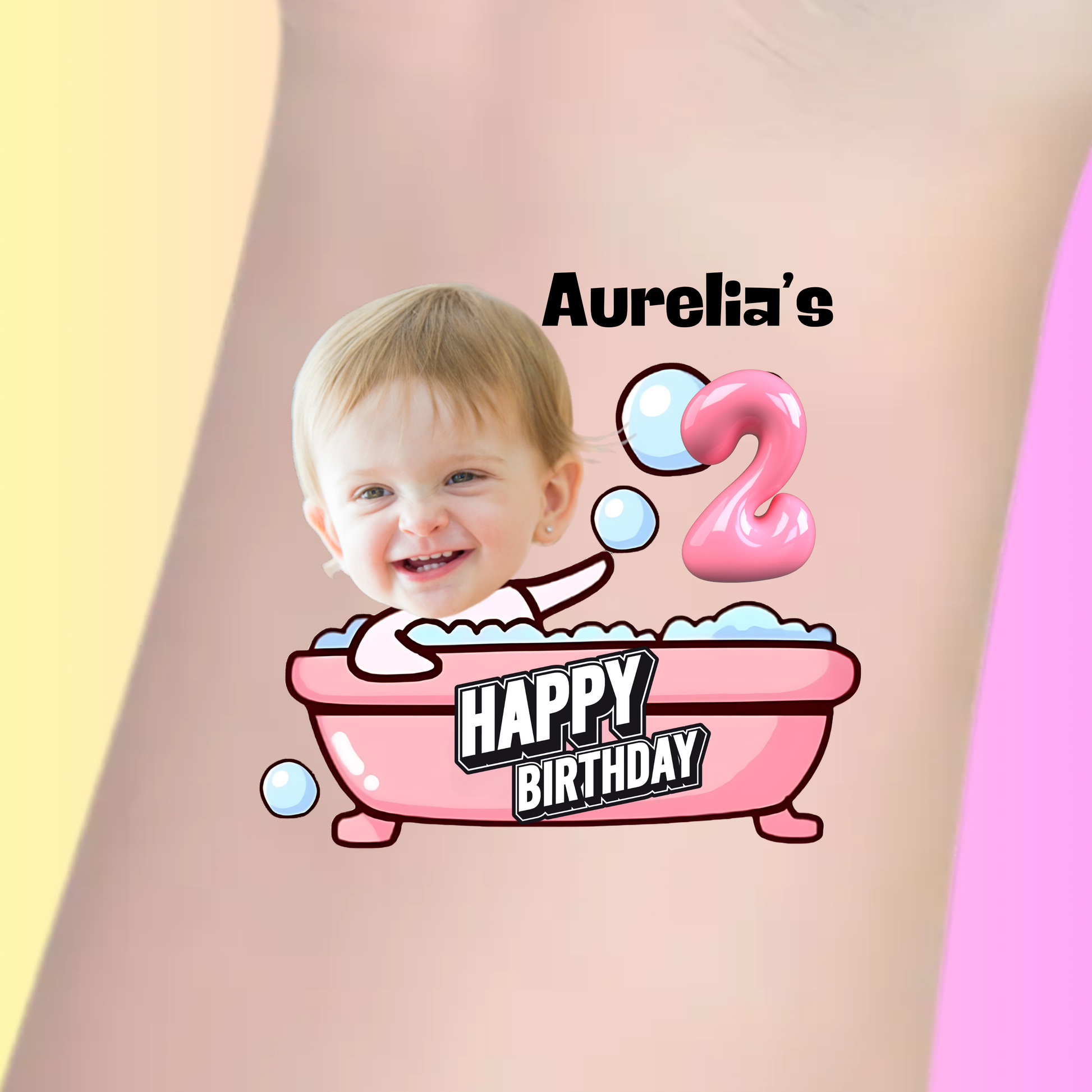 Add a splash of fun to your child’s celebration with our "Bubbly Birthday" custom tattoo! This playful design features the birthday star’s photo, name, and age, enjoying a bubbly bath in a charming pink tub with festive birthday elements. Perfect for bath lovers and whimsical-themed parties, this tattoo brings joy and uniqueness to any special day.