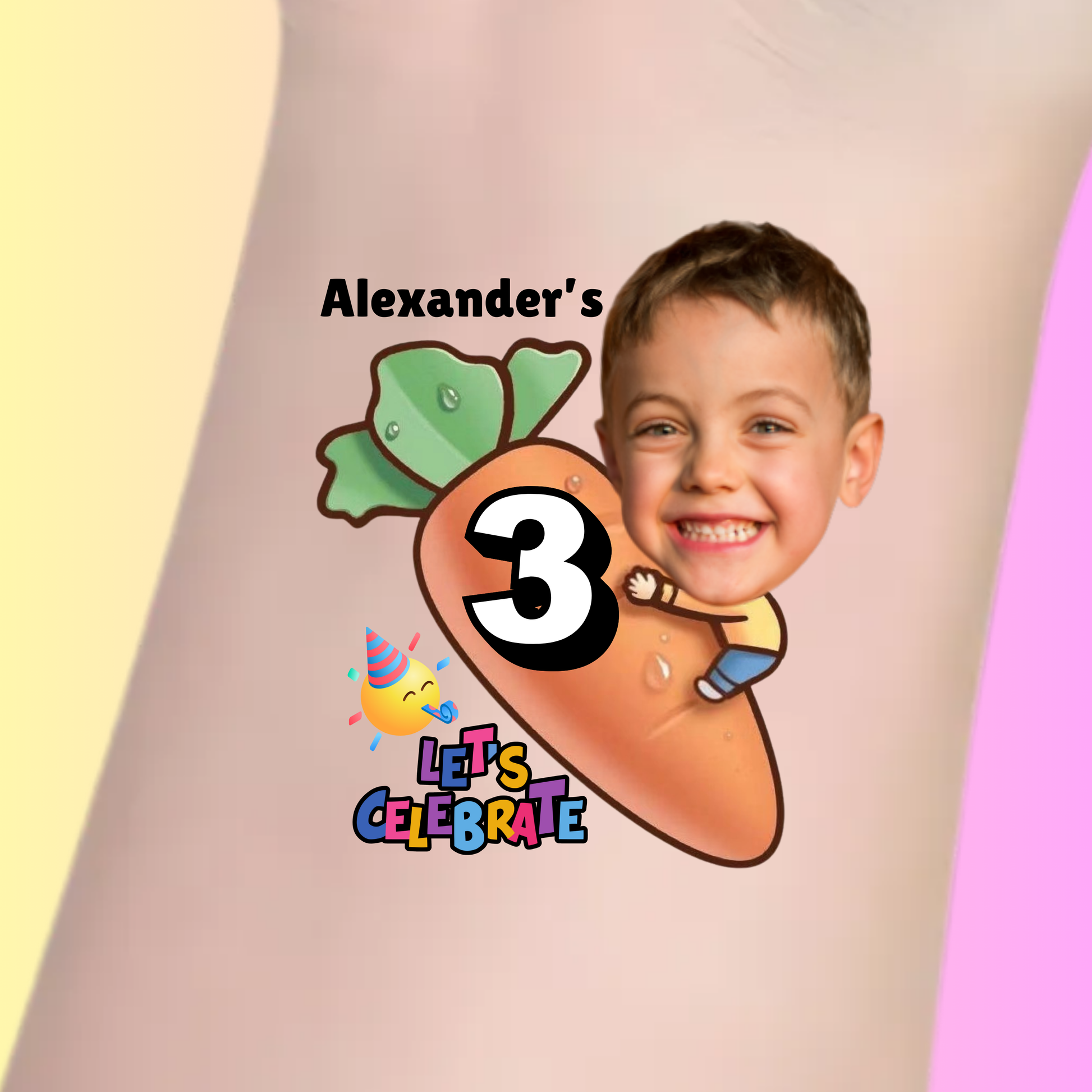 Hop into birthday fun with our delightful "Carrot Celebration Birthday" custom tattoo! This playful design features the birthday star’s photo, name, and age, hugging a vibrant carrot with cheerful “Let’s Celebrate” accents. Perfect for farm or vegetable-themed parties, this tattoo adds a unique and charming touch to your child’s special day.