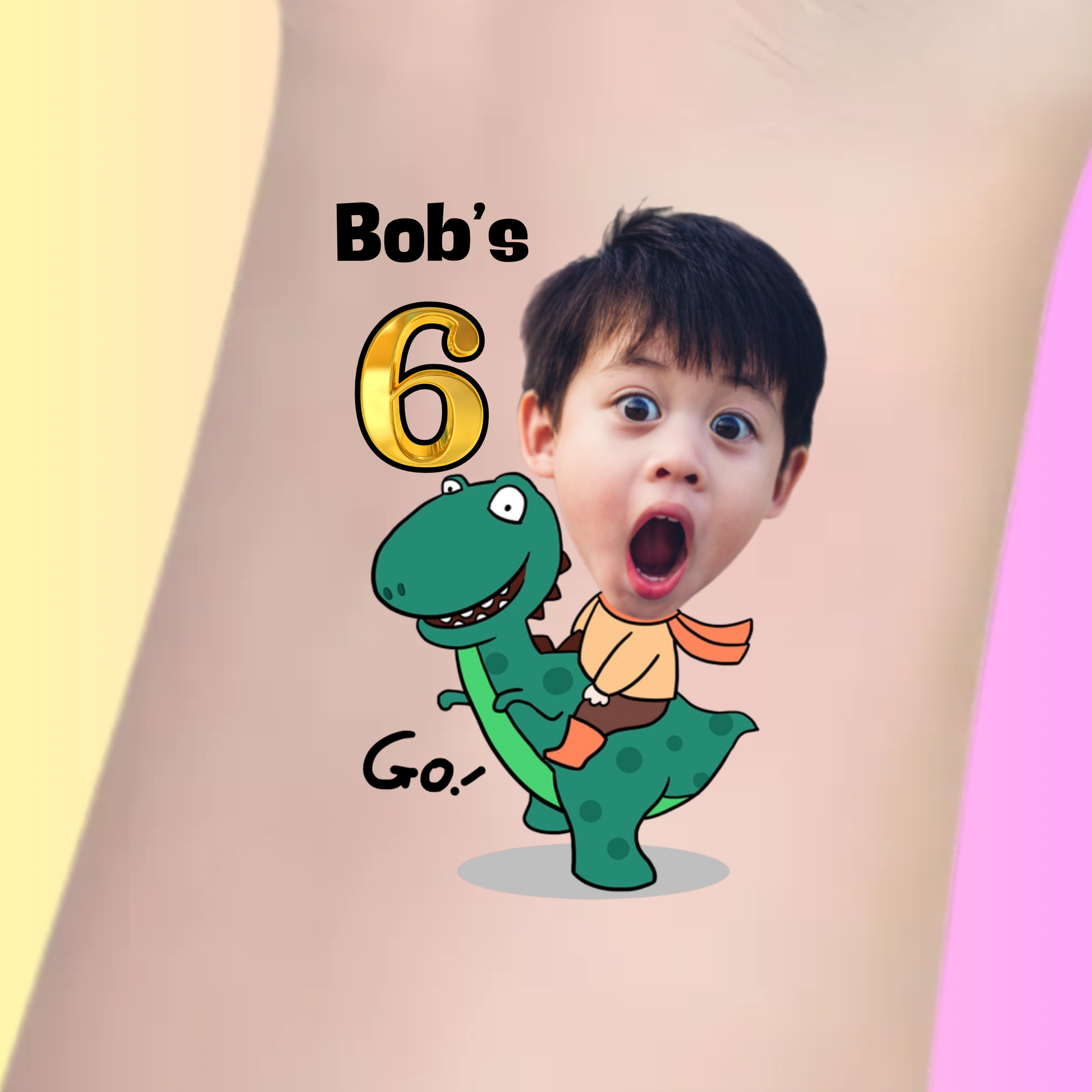 Add some roaring fun to your child’s birthday with this custom tattoo that’s sure to be a hit with dino fans!