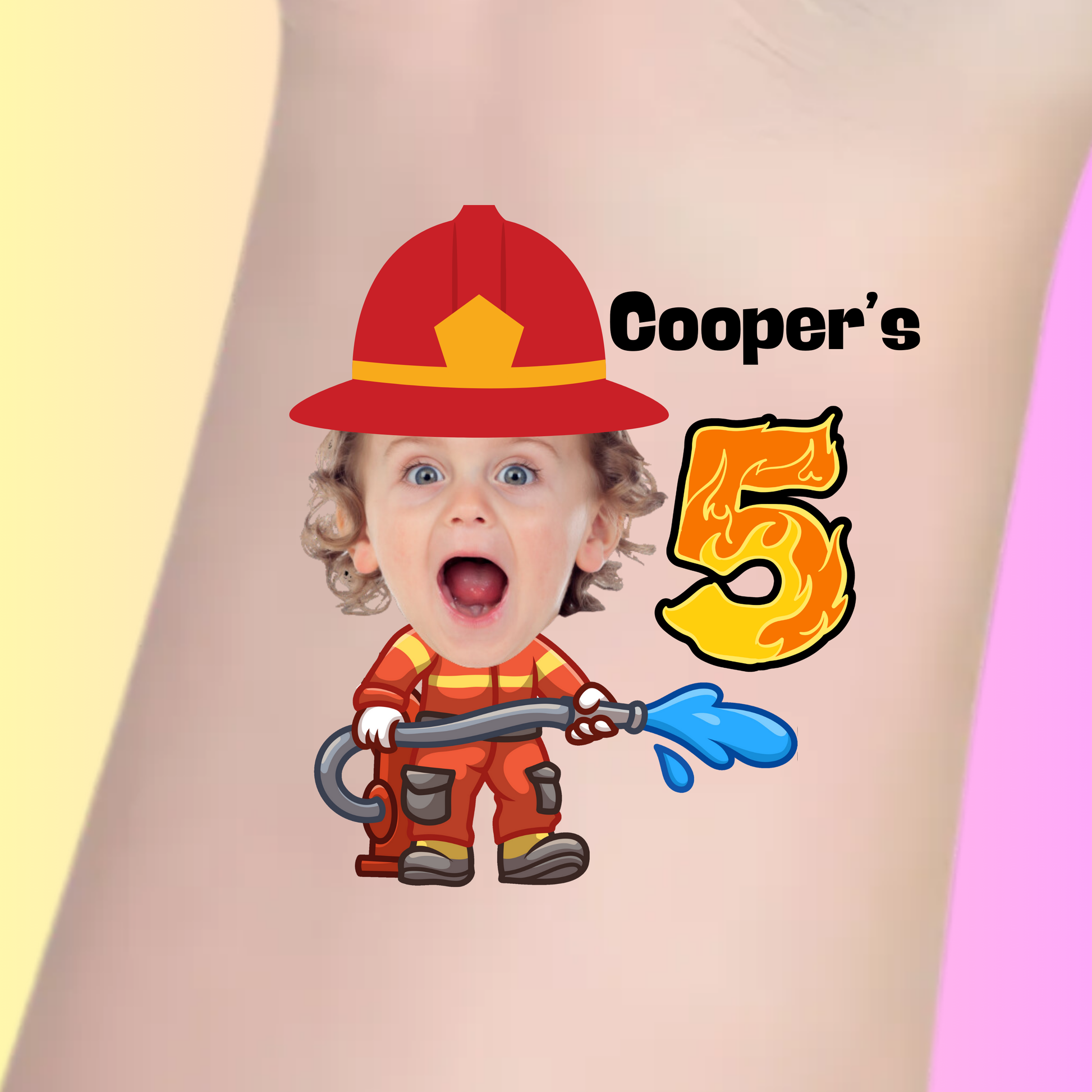 Make your child’s birthday celebration a blazing success with our "Firefighter Birthday" custom tattoo! This fun and exciting design features the birthday star’s photo, name, and age, dressed as a brave firefighter with a hose in hand and flames to match their big day. Perfect for little heroes, this tattoo adds a unique and playful touch to any party.