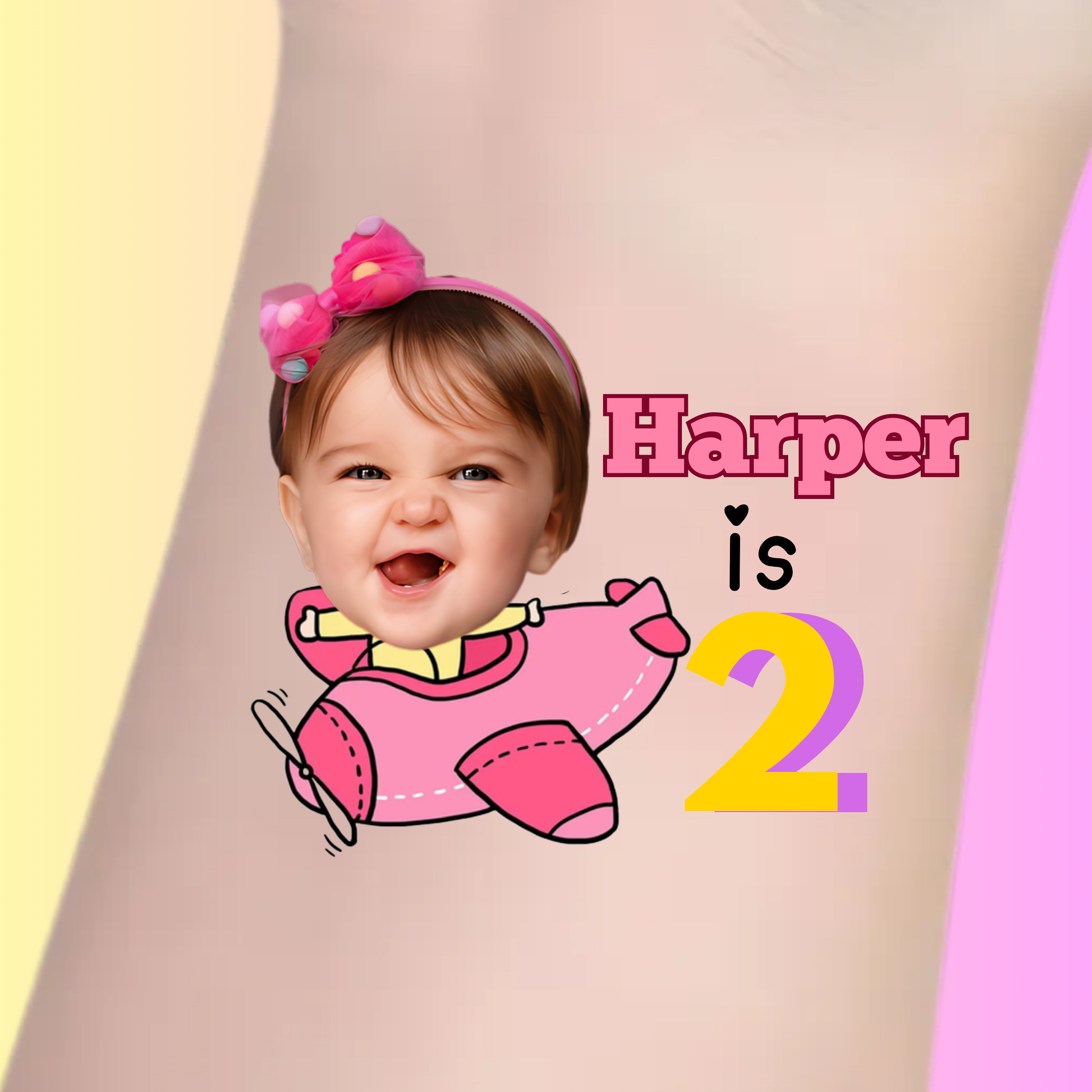 Celebrate a little one’s big day with our "High-Flying Birthday" custom tattoo! This adorable design features a personalized photo and age in a charming airplane theme, complete with a cute pink plane and vibrant colors. It’s perfect for young aviators who are ready to soar into a new year with style!