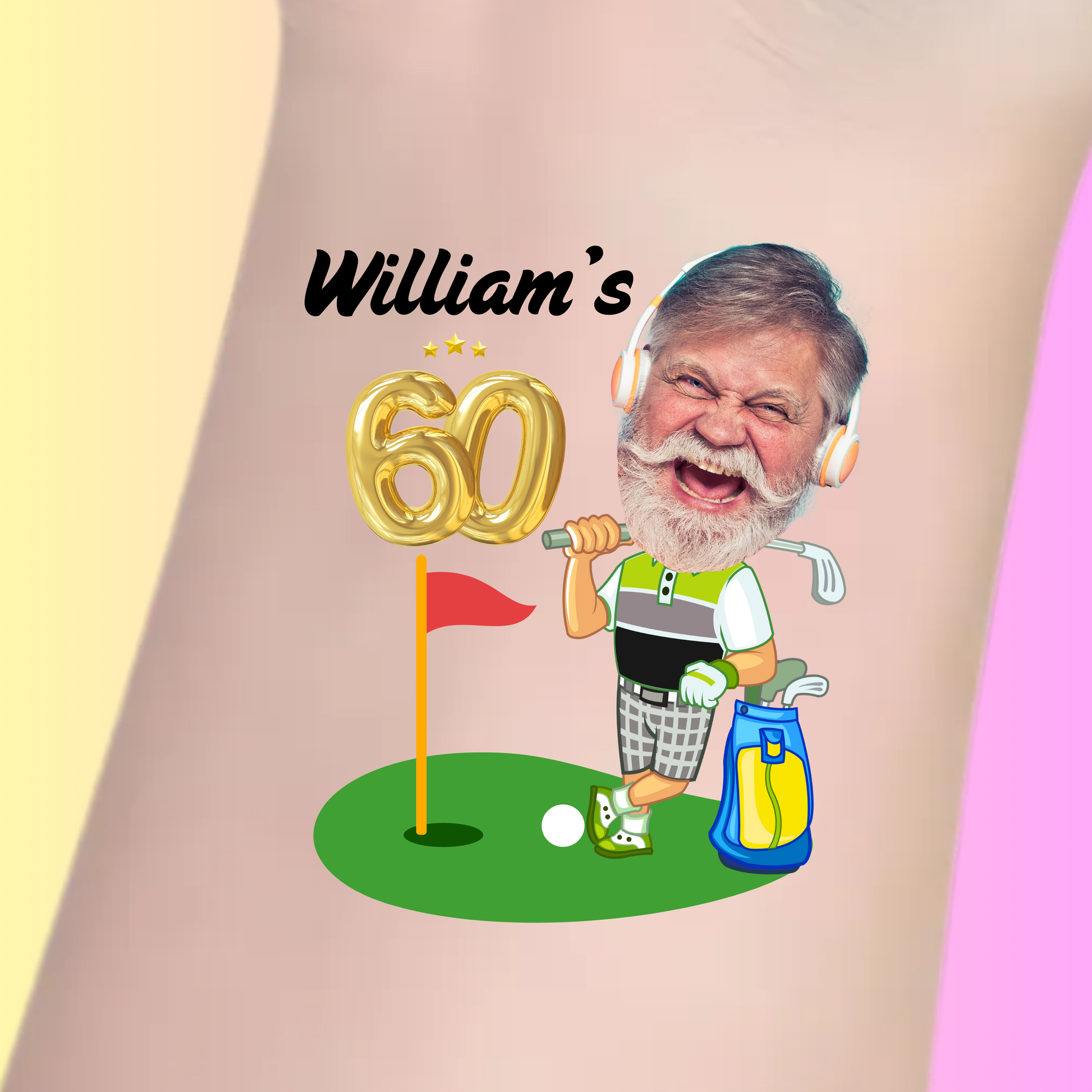Make any golf enthusiast’s birthday a true hole-in-one with our "Par-Tee Time Birthday Tattoo!" Perfect for a golf-themed celebration, this playful tattoo design captures the fun of the fairway, featuring a caricature golfer, a celebratory balloon number, and a custom name to mark the special occasion. Personalize it with the birthday star’s photo and their age to make it a unique keepsake that’s guaranteed to be a hit on the green!