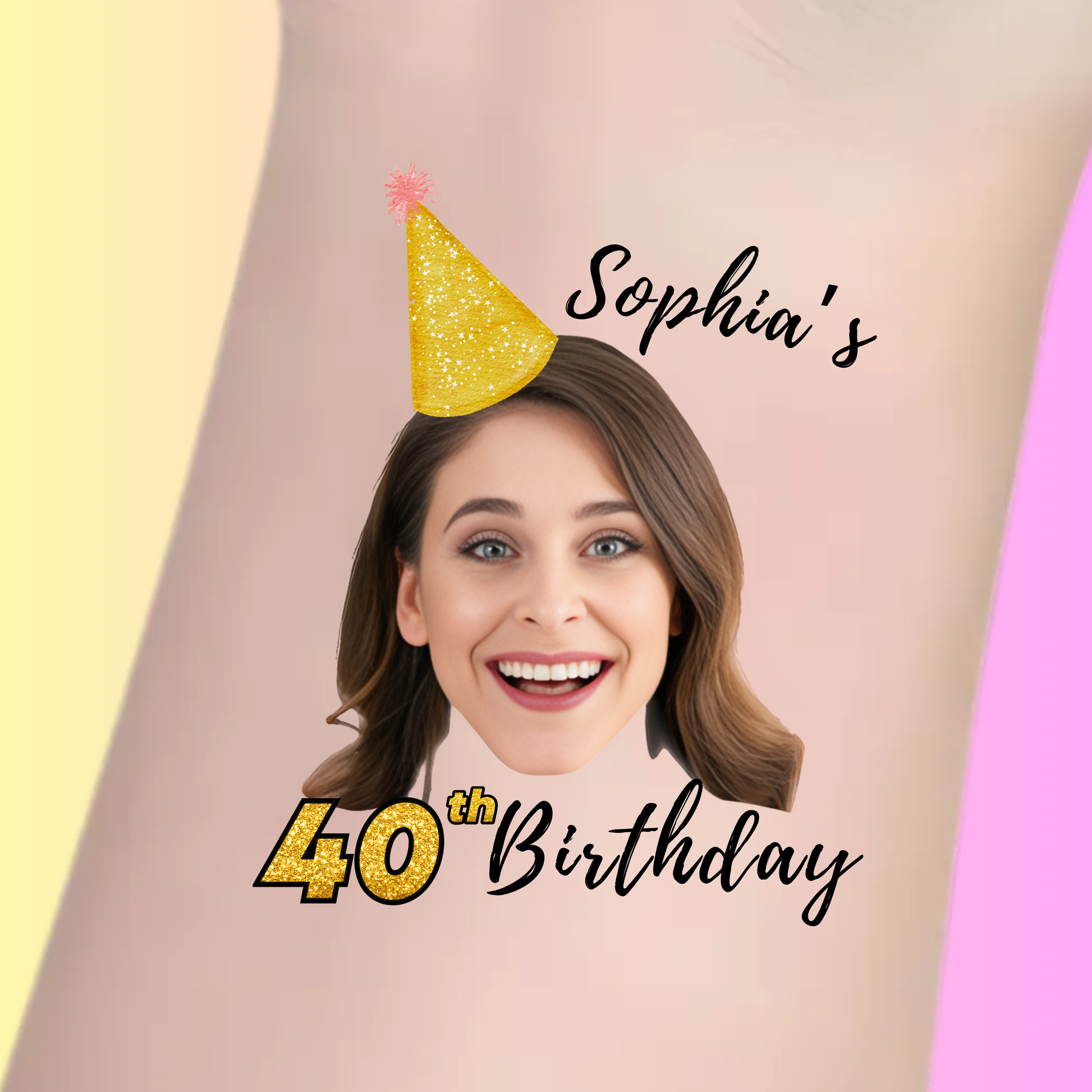 Bring extra sparkle to any birthday celebration with our "Sparkling Birthday Celebration" custom tattoo! This fun design features a glittery party hat, cheerful font, and space to personalize with the birthday person’s name and photo, adding a special touch to the festivities. Ideal for any birthday gathering, this tattoo captures the joy and excitement of the occasion, making the birthday star stand out.