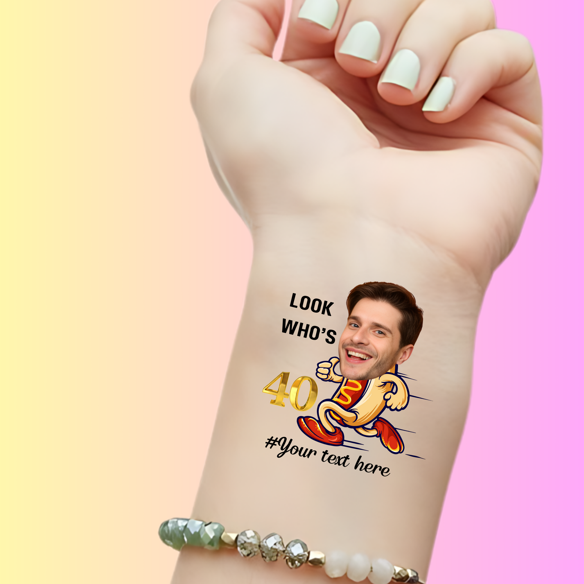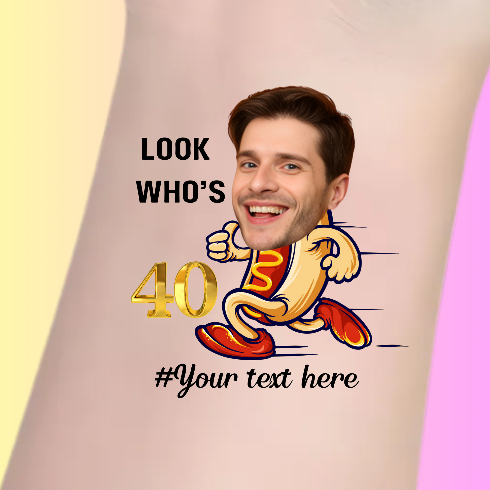 Spice up any birthday celebration with our "Hot Dog Celebration" custom tattoo! This playful design is perfect for adding a unique, fun twist to the party, featuring a cheerful hotdog character, bold customizable age, and room for the birthday person’s name and photo. Whether it’s a milestone or just a fun way to mark the day, this tattoo is sure to be a hit.