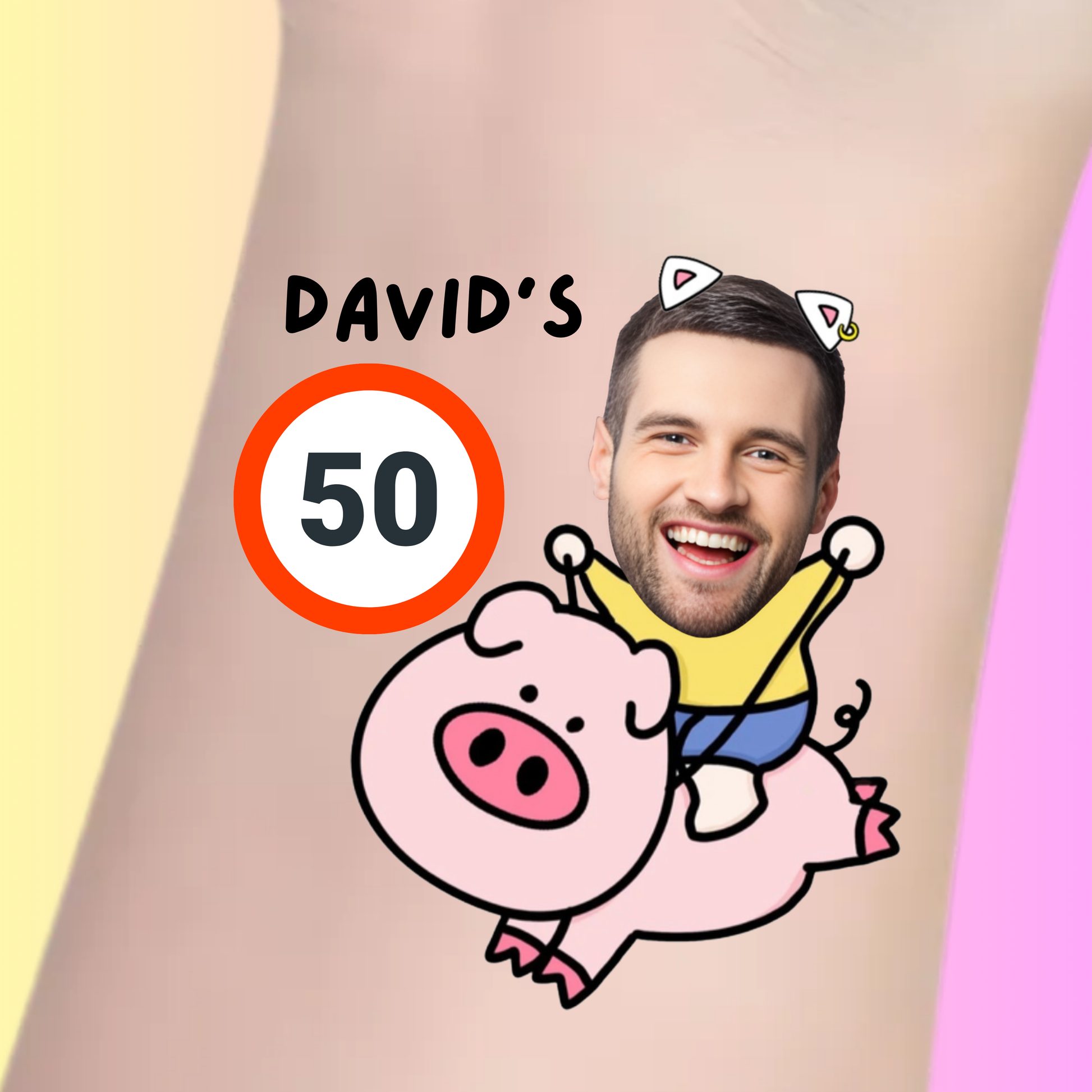 Celebrate any birthday in a fun and unique way with our "Speedy Piggy" custom birthday tattoo! Featuring a quirky character riding a playful pig and customizable age sign, this design is sure to bring a smile to everyone at the party. Personalize it with the birthday person's name, a photo, and the desired age, making it a special addition to the celebration.