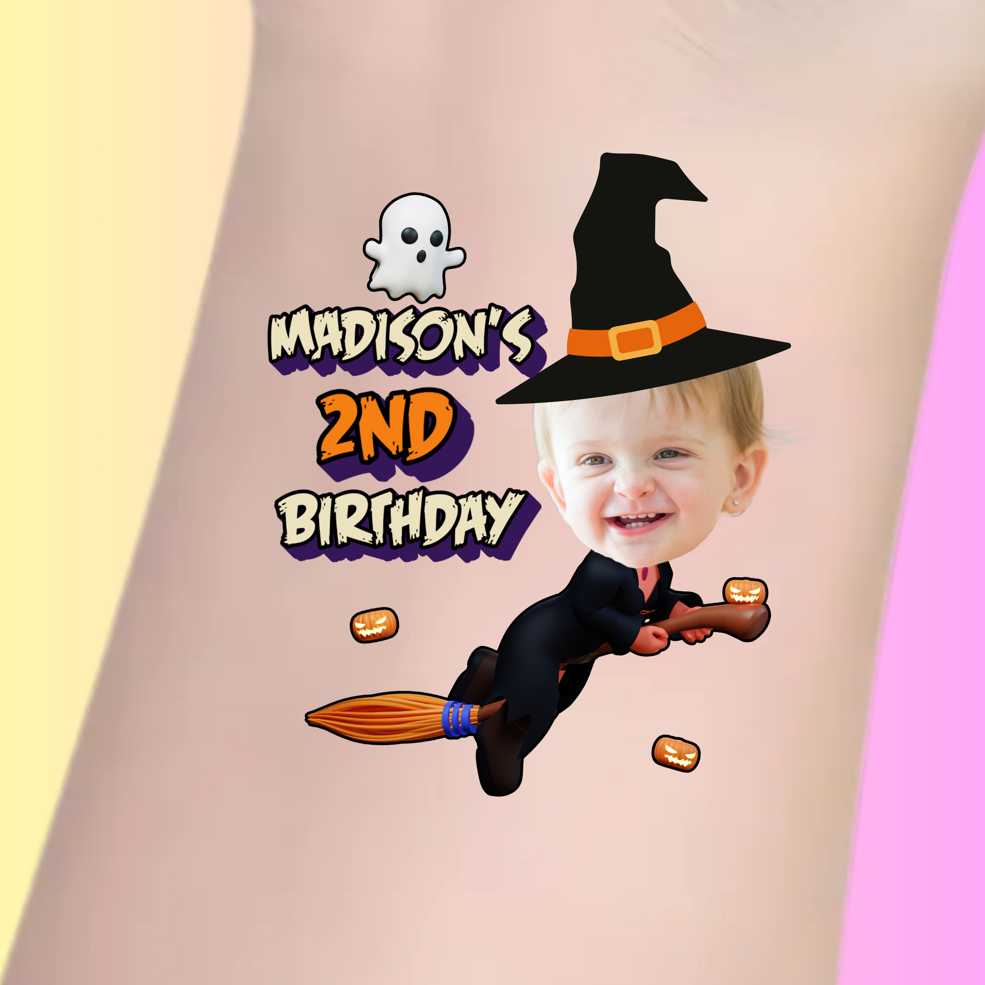 Cast a spell of fun on your child’s birthday with our "Spooky Witch Birthday" custom tattoo! This magical design features the birthday star’s photo, name, and age, dressed as a cute little witch flying on a broomstick, complete with festive Halloween elements like pumpkins and ghosts. Perfect for Halloween or spooky-themed parties, this tattoo adds a whimsical and fun touch to their special day.