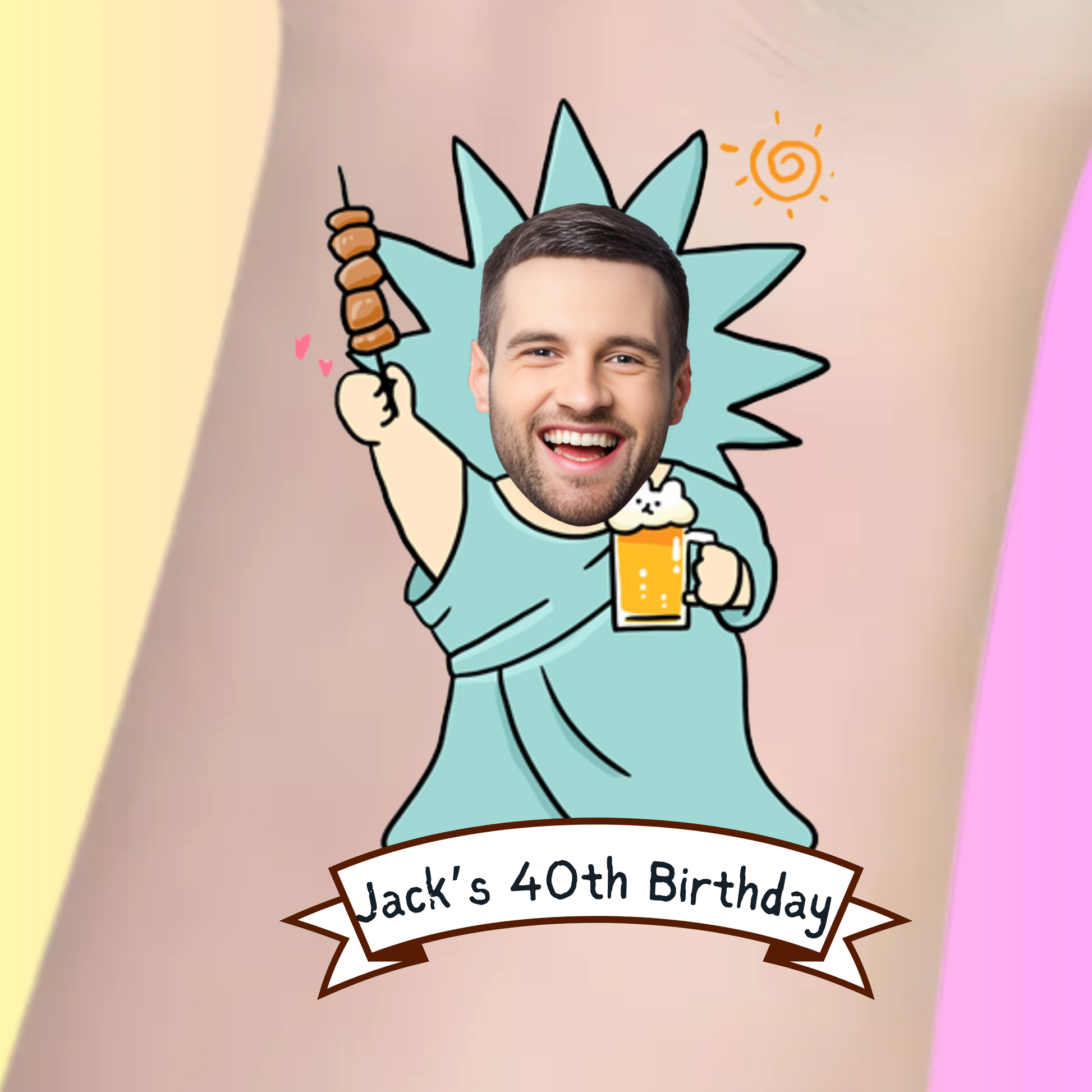Add a fun and patriotic flair to any birthday celebration with our "Statue of Liberty" custom birthday tattoo! Perfect for those who love to enjoy life's freedoms, this unique design features the iconic Statue of Liberty holding a beer and skewers, making it the ultimate symbol of fun and celebration. Customize this tattoo with the birthday person’s name and photo to create a memorable party favor.
