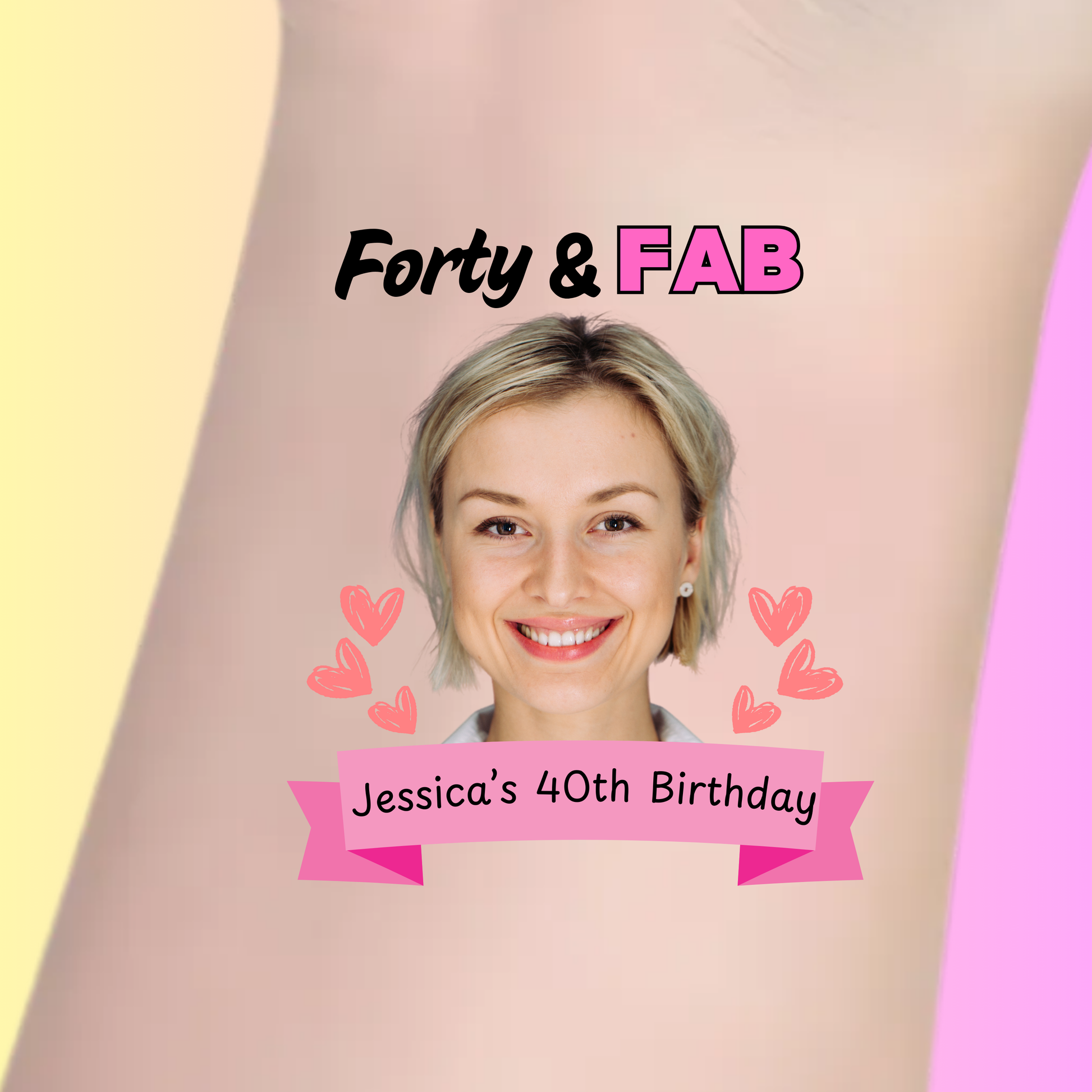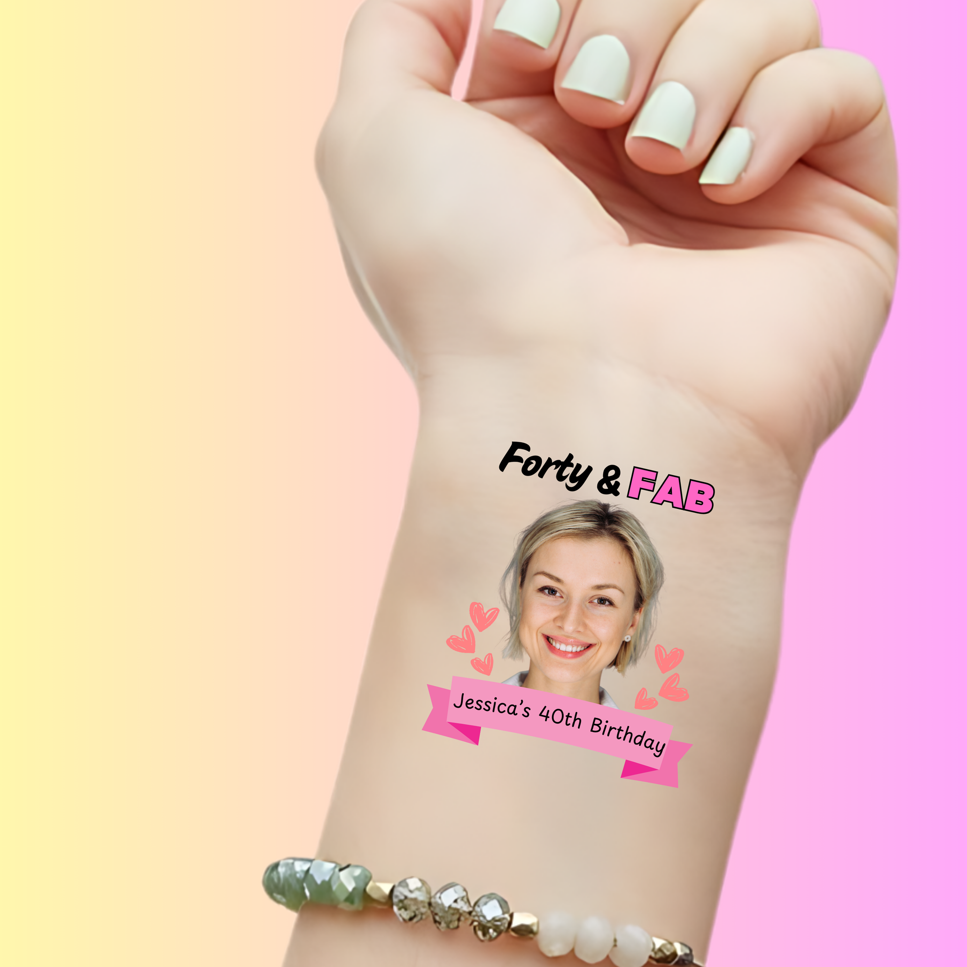Add a stylish and personal touch to any birthday celebration with our "Still Fabulous" custom tattoo! This chic design features a trendy banner, playful hearts, and space to add the birthday person's name and photo, making it the perfect accessory for a fabulous birthday bash. Whether you’re hosting a themed party or an intimate gathering, this tattoo adds a unique flair that’s sure to make the birthday honoree feel extra special.