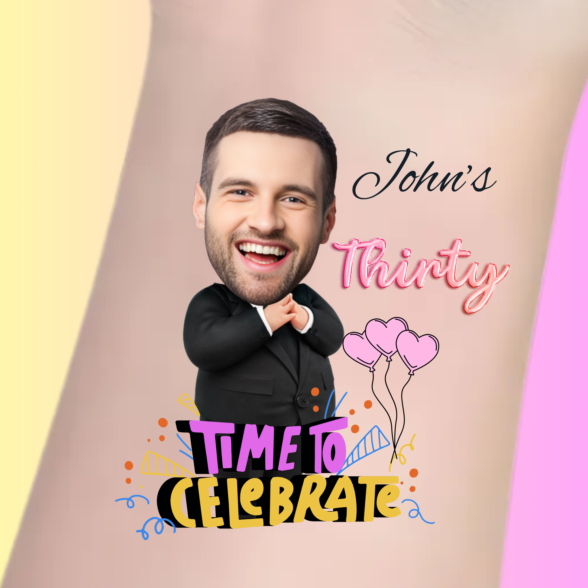 Get ready to celebrate in style with our "Time to Celebrate" custom birthday tattoos. Whether you're marking a big milestone like the 30th, 40th, or any age, you can personalize this tattoo with the birthday person’s name, age, and fun celebratory text. Simply send us a photo of the guest of honor, and we’ll create a one-of-a-kind tattoo featuring their face, along with playful icons like balloons and the phrase "Time to Celebrate" in a vibrant, party-themed design.